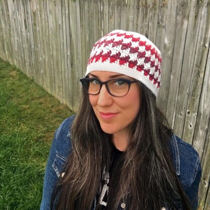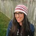 This beanie coordinates with the Floating Triangles Scarf and uses self-striping yarn which makes the color changing rows much easier than it looks. Using contrasting colors for the yarn gives a bold look or use more coordinating colors (like in the Scarf version) for a neutral look.