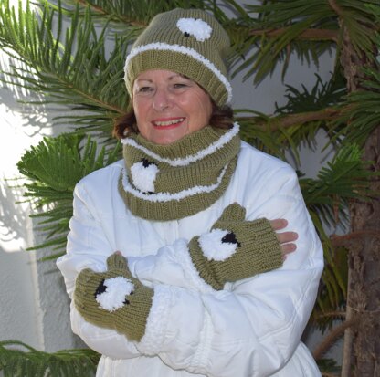 The Flock of Sheep Winter Warmers knitting pattern features white fluffy sheep and includes instructions for the gloves, hat and 2 sizes of cowls. I have knitted the main colour in green, but you could change the colour of the Aran/Worsted (10 ply) yarn to match your outfit.