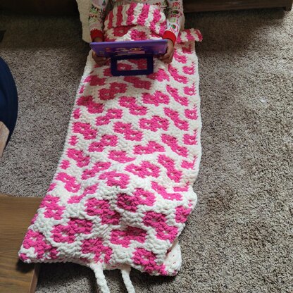 Floor mat and pillow! Perfect for the floor dweller in the family. Worked in bulky yarn for that extra squishy, cozy factor. Use it has a sleep over bag; snuggle pillow and throw to read or watch your favorite show or just a simple pillow and blankey. It is made to easily stow away when done using it. It is a fantastic addition to your cozy makes.