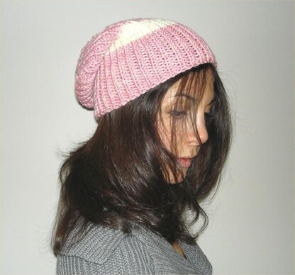 This is a quick and easy knit. A very flattering style and easy to wear with anything. You will need a #10.5 needle and approx. 100 yards of a main color and 30 yards of a contrasting color for the stripe. The yarn should gauge 14sts= 4" in stockinette.