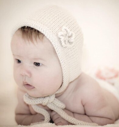A simple bonnet with reverse stocking stitch ties and an easy knitted flower. Knitted in one piece.