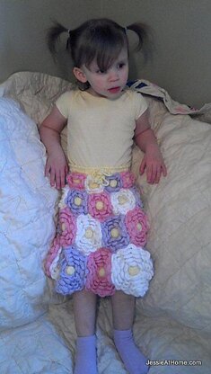 Flora was originally created as a part of a Flower Faerie costume for one of my daughters. Many photos where snapped during its creation. The result is a lovely written pattern accompanied by many pictures to help you along! Flora can be made to the length of your choice, just keep in mind that this skirt tends to grow, so don’t make it too long. Instructions for an optional leaf and vine trim for the hem is included. At the end of this pattern you will find some line drawings you can use to help plan out colors. There are even a few hem variation ideas listed at the end of this pattern to help you make Flora fit your personality. The fun floral skirt pictured in this pattern was made with Bernat Softee Baby in various colors, but you can use any DK weight yarn of your choice.