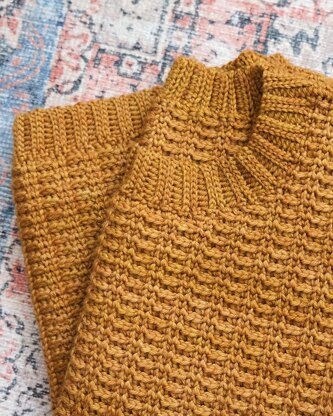 This crochet sweater is a cozy t-shirt style sweater with a classic fit. It features a unique, subtle texture and classic ribbing around the neckline, sleeves, and bottom hem.