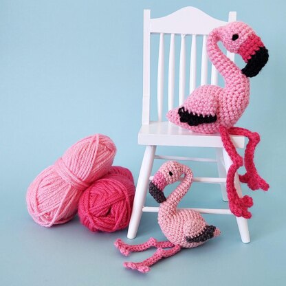 Flora the Bitty Flamingo is an intermediate-level pattern. Skills you will need include single crochet, half-double crochet, slip stitches, increases, decreases, working in the top and bottom of a foundation chain, crocheting through both layers to finish, joining pieces together, and some seaming.
