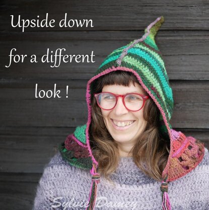 A fun pixie hood, explained in 2 sizes (both fit adults - smaller size will also make a large hood for kids - Shown here in larger size) just like its sister design, the Taïga hood.