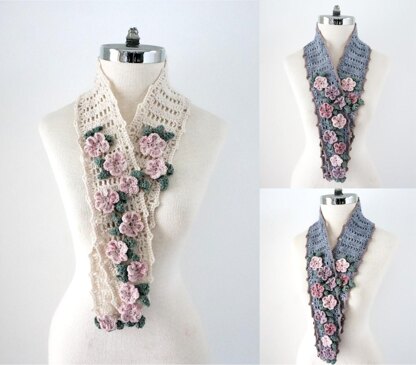 The Floral Elegance Scarf crochet pattern is perfect for any time of the year with the beautiful lace scarf accented with a floral touch with an elegant essence. A beautiful array of flowers and leaves adorn this scarf. Designed with a fingerling/sock weight yarn perfect for any time of the year. Inspired by peaceful moments walking along the garden path or the floral trees blossoming in spring bringing new beautiful moments to enjoy. The Floral Elegance Scarf has an elegant lace design accented with lovely flowers.