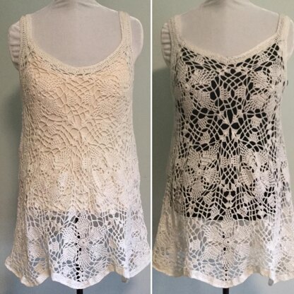 Finished Size Laid flat after blocking (unstretched), the garment measures 32”(81cm) from top of strap to bottom of hemline and 24”(60cm) from neckline to hem. The neck opening is about 10”(25cm) across. The straps fall about 5”(12.5cm) from the top of shoulder. The garment is about 16”(40cm) across from underarm to underarm, increasing to 24”(60cm) across at the waist and 30”(75cm) across at the hemline.