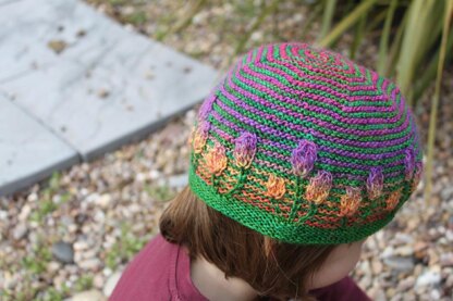 Slipped stitches and variegated yarn help to create the wonderful flower garden that adorns this hat and because you are only ever working with one yarn at a time it is a really quick and simple knit, it's a great project for using up leftover sock yarn.