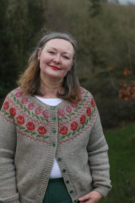 The Floribunda cardigan is a wonderful addition to any wardrobe, with a stocking stitch body and sleeves, and featuring an elegant yoke pattern with striking stylised roses. Floribunda is knitted in DK yarn with a simple construction, making it an enjoyable, interesting and speedy knit. It is worked in the round from the bottom up with a steek worked at the centre front of the cardigan.