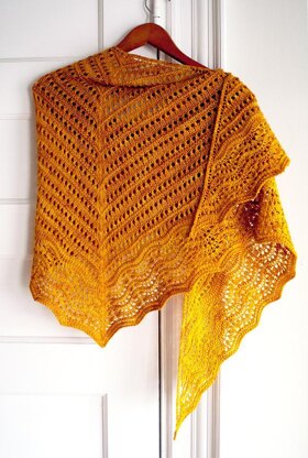 The triangle begins with a simple eyelet and garter ridge pattern in the main body to the border, where lateral braids are worked within an updated shale lace motif, ending with a simple bind-off on the wrong side.
