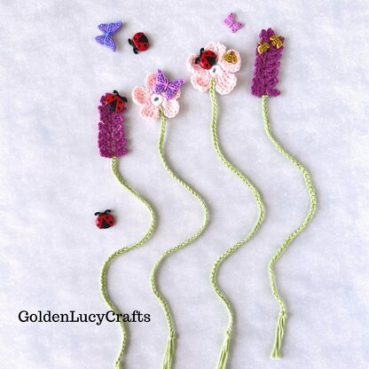 This pattern is for two flower bookmarks - a lavender bookmark and a cherry blossom bookmark.