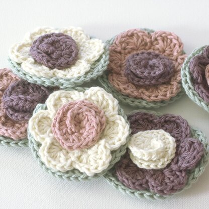 A quick and easy crochet pattern for flower face scrubbies in three layers. Make some pretty flowers to pamper yourself. The pattern calls for soft cotton; I used I Love This Cotton in pale colors, cream, rose and violet on soft green. Hold them by the little flowers and use the green side on your face. A lovely gift for a bridal shower or housewarming or Mother's Day. Eco-friendly, wash gently and use again and again. They are also make lovely bathroom decor piled in a little basket. Each is a scant 4 inches across.