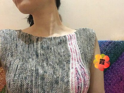 Flower Feather (FF) is a sleeveless top with a boat neck work in garter stitch knit sideway. Added a color work using German short row.