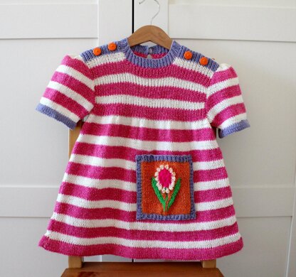 This beautiful baby dress is knit in pieces and sewn together when finished. Large pocket with adorable flower and leafs make this dress absolutly beautiful for any baby or toddler girl! You can play with an infinity color yarn combinations to make this cute baby/toddler dress
