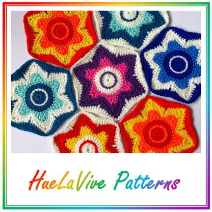 This pattern is for making crochet flower hexagons, which could be used individually as coasters; or can be joined to create a blanket, sweater, bag, rug, or anything else you like.