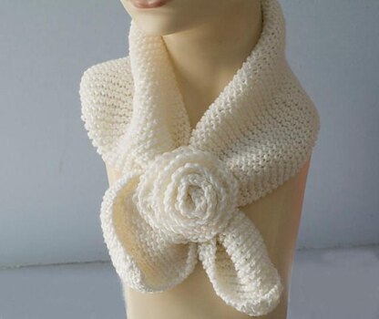 Want a little warmth for your neck without the bulk of a big scarf? This little neck warmer will stay in place with no fuss . To wear it you simply slip one end of the scarf into the keyhole at the other end. The keyhole is embellished with a pretty crocheted rose. The scarf is appropriate for a knitter with average skills or an adventurous beginner. Most of the scarf is easy but a beginner may have a little difficulty with the key hole though I have tried to give very simple instructions. Basic crochet skills are also needed to make the rose embellishment.