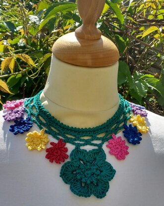 Cute colorful flower motifs are joined to a trellis neck band as they are worked to create this crochet necklace. Worked in dk/light worsted 100% cotton and a 3.5mm/ E hook. Ideal for using your favourite colourful left over cotton yarn. Necklace is perfect for dressing up a plain white t-shirt. Or why not make it as a gift.