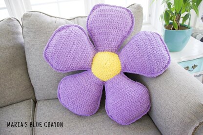 This fun, big flower crochet pillow is the perfect statement decor piece. This crochet pattern uses basic stitches with a 6.5mm hook and Super Bulky Bernat Blanket yarn.