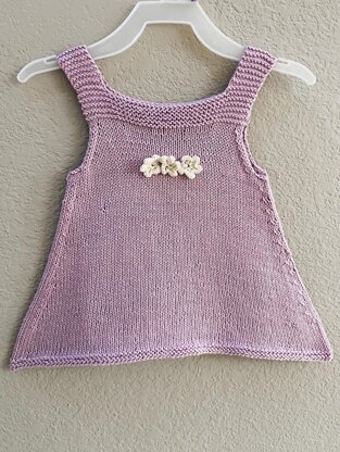 The flower pinafore dress is worked seamlessly in the round, from the bottom-up, then the front and back are worked flat separately. The garter stitch is worked on either side of the dress and continues along with the straps.