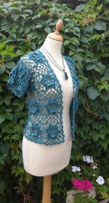 This is a pattern for a versatile bolero which can be worn for any occasion. Crocheted in 100% Dk cotton. The bolero is made up of 34 3D flower squares which are joined together as they are worked. A shell boarder is then worked to complete the garment.
