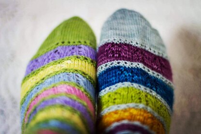 Yarn Used Limmo-design Hand dyed sockgarn, 420m/100g in five colours MC Grön I/Silver: 120 (140, 160) m / 130 (150, 170) yards CC1 Syren/Plomon: 40 (65, 85) m / 45 (70, 90) yards CC2 Citron/Petrol: 40 (65, 85) m / 45 (70, 90) yards CC3 Himmelsblå/Grön I: 40 (65, 85) m / 45 (70, 90) yards CC4 Rosa marsipan/Curry: 40 (65, 85) m / 45 (70, 90) yards Note that meterage / yardage may differ depending on the length of the sock. Gauge On 2.25 mm / US1 needles: 38 sts and 52 rnds = 10x10 cm / 4x4” in st st, 36 sts and 54 rnds = 10 x 10 cm / 4”x4” in striped lace pattern I am a tight knitter so you may need to go down a needle size to obtain gauge. Notions & Needles 2 stitch markers 1 movable stitch marker Tapestry needle Scrap yarn in contrasting colour 2.25 mm / US1 circular needles 80 or 100 cm / 32” or 40”, or size needed to obtain gauge