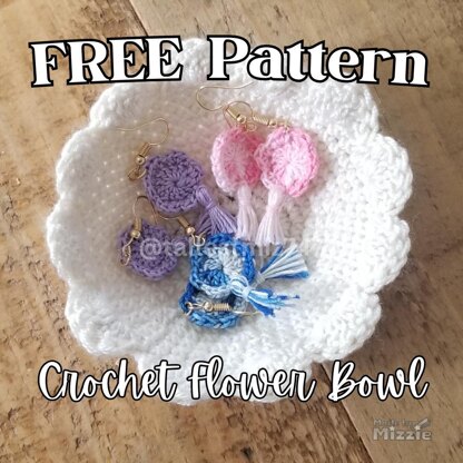This Pattern uses sport weight, size 2 yarn using a 3.75 mm hook. The finished bowl measures about 4 inches in diameter. This pattern uses mainly single crochet, then double crochet for the petal edge.