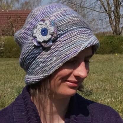 The hat is worked from the bottom up, in garter-stitch throughout. The brim is worked in rows, before joining in the round for the body. The colours alternate each row: this is easy to achieve when working in the round, but a bit harder for the brim. This technique is fully described in the pattern.