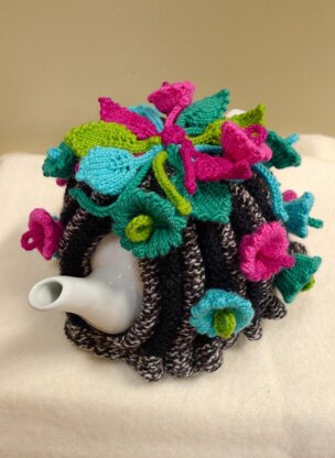 This is a gorgeous and bright tea cosy. On a black and grey ribbed background. The holes are actually knitted into the fabric and then the flowers are picked up and knitted out of these holes for a spectacular effect. Using vivid pinks, aqua , blues and bright green you will produce a tea cosy which is truly a work of art.