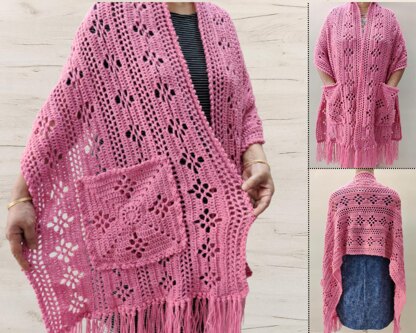 This is a beautiful shawl works up fast and uses filet crochet and a mesh pattern. It is much easier to make than it looks and can be worn over any outfit. It has a lovely picot border giving it a delicate look. The shawl can be made in any size, the pockets and fringe are optional.