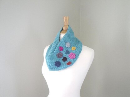 A cozy cowl, infinity scarf and cute matching hat or headband with cheery colorful flowers – you choose how many you want - a bouquet of three in a single color, or an entire rainbow garden!
