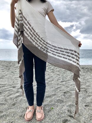 Flowing light is a top-down crescent shape shawlette trying to capture the changing of light. The shown project used lyocell yarn which would glitter under sunshine. The main pattern was inspired by Chinese bamboo weaving basket, then merged with simple lace knitting. This shawl was started with I-cord liked border stitches and stockinette, then work with easily remembered lace pattern, simple color changing and I-cord bind off.