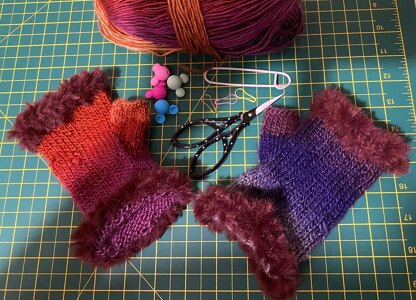 Due to the yarn’s variegation each mitt has unique colour combinations so I added a complimentary colored faux fur trim to make a color matched pair.