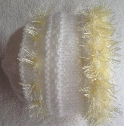 5Fun time for Easter with this fluffy brim hat, the fluffy yellow looks almost chick like and lots of fun. You could change the colour and make it look nice with any little outfit for another time of year. Quick and Easy to do, fun to knit and fun to wear, 4 sizes to choice from Preemie, Newborn, 1 - 3 months, 3 -6 months, 6 - 12 months. I used Hayfields baby soft in the photos, but have knitted it in a Merino soft yarn which I needed to use different needles. The king Cole tinsel yarn takes approx. 20 -30 yards. Stylecraft Eskimo is another nice fluffy yarn to use.