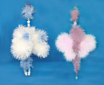 Here are 2 patterns for the fluffiest, cutest pram charms - a butterfly and a pair of booties. Very easy to knit with King Cole Chunky Tinsel yarn on 3.25mm straight needles.