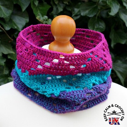 Inspired by Flourite Quartz Crystals, which are beautiful colourful minerals that crystalise in cubic form, I've put together a cowl which features a repeating filet 'cube' shape.