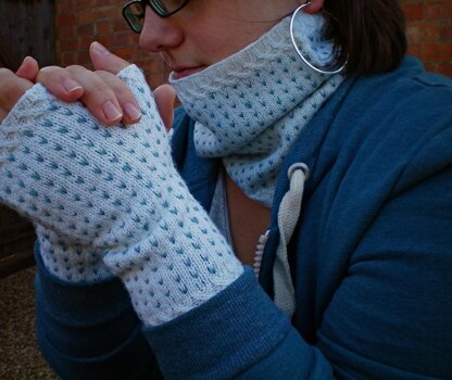 Reminiscent of blustering snow flurries, this matching set of cowl and fingerless mittens is both cuddly and delicate. Tiny cabling detail allows the ribbed edging to transition into colorwork gracefully, while the stranded colorwork body provides extra warmth and endless color possibilites!