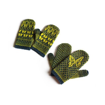 The back of the mittens features a clouds of rising butterflies, from the distant squall of yellow specks up t the fully fledged butterflies as the butterfly form becomes more and more apparent. The palms of the mittens feature a lattice pattern, on top of which, on the right hand mitten, is a large, detailed butterfly.