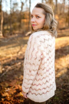 Light and airy, this boxy deep v-neck cardigan is created within a stockinette-based fabric stitch pattern. Choose to work it with low or high contrast, or even in a single color. Either way, the texture will make it pop. Buttonband is worked alongside the sweater for simple & minimal finishing and stripes are worked intarsia. Sweater is worked from the bottom up with charted neckline shaping and drop-shoulder style seamless sleeves. Primary stitch pattern is worked throughout body and sleeves and is written as well as charted. Knit the size that is 8-12”/20.5-30.5 cm larger than your actual bust measurement; shown in Size 3 with 10”/25.5 cm positive ease. Pattern is designed for experienced knitters comfortable with reading their work and ready for a challenge.