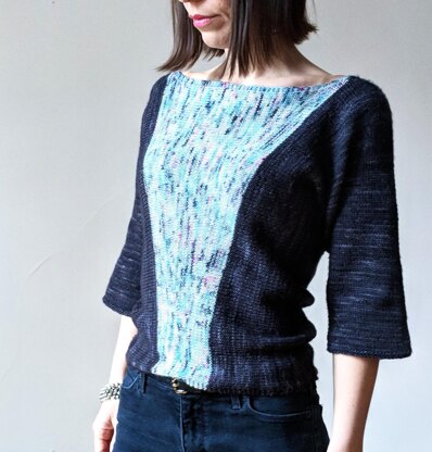 This lightweight tee shirt is knit flat from side to side, beginning at the cuff of one sleeve, across the body to the other cuff. German short rows are used to shape the body, with a flattering V shape created by using a contrast colour.