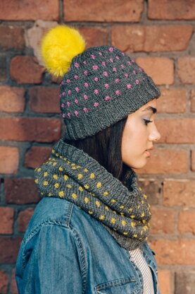Cute hat and cowl with easy to work fake bobbles. Patterns includes a hat with turnback and without as well as instructions for knitting flat or in the round.