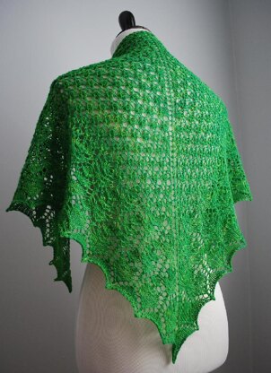 "Foglie e Cardi" means "Leaves and Thistles" in Italian, and this shawl features lace motifs that resemble both. It is worked from the top down, starting with a garter tab, and has both charted and written directions.