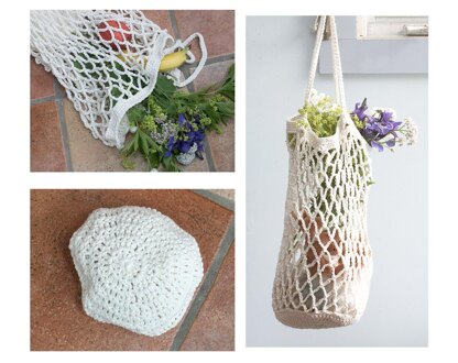 This simple net market bag folds into itself to make a handy carry along pouch. The pouch is small enough (about 7 inches across) to tuck into your purse and pull out at the grocery store or farmers' market. It calls for readily available Lily Sugar n Cream cotton yarn but you can substitute another worsted weight yarn.