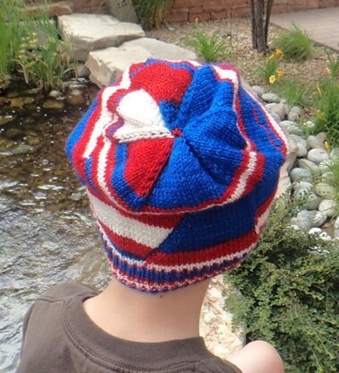 The Folded Blanket Hat uses unusual construction makes the colors into triangles, trapazoids, and wide and narrow stripes. The hat is worked with short-rows in strips and joined as you knit. The crown can either be worked in the round or in short-row triangles, finishing with either grafting or a short three-needle bind off.