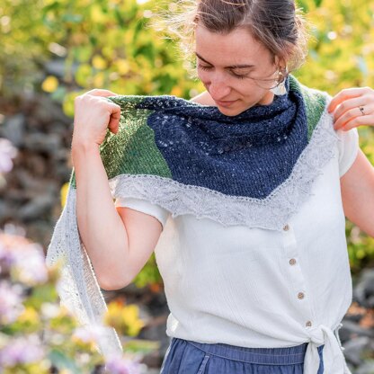 Folia is an elegant shawl worked sideways, with 3 colors of light fingering weight yarn. It is made of garter stitch paired with a lovely lace pattern that is worked in bands, adding delicate leaves on the shawl. When the shawl is completed, stitches are picked up along the bottom edge to create a border that is embellished by a picot bind off.