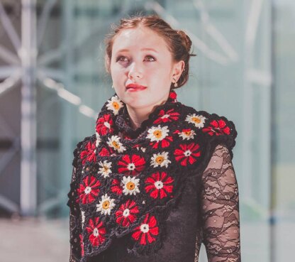This shawl is made using The Mercerie's DK merino in Black, Scarlet, **Sunshine **and Cloud; the full breakdown of colours is in the pattern. It is constructed using 45 large, individual flower motifs, joined together as you work and smaller daisies are worked in between, with a final decorative edging worked round all 3 sides.