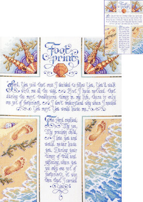 By Sandy Orton. "Lord, you said that once I decided to follow you, you'd walk with me all the way. But I have noticed that during the most troublesome time in my life, there is only one set of footprints. I don't understand why when I needed you most you would leave me. The Lord replied, 'My son, my precious child, I love you and would never leave you. During your times of trial and suffering, when you see only one set of footprints, it was then that I carried you'"\nFootprints is a beautiful sentiment and this lovely depiction of footprints in the sand is timeless. Stitch this beloved inspirational poem for someone special in your life. Quality motifs, beautiful colors, and subtle shading are hallmarks of this design.