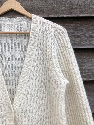 The Cardigan is worked flat from top down by shaping the yoke with increases over the shoulders, sleeve cap and body together with front edges before sleeves and body are separated. Pocket openings are worked into body and pocket bags are worked last and seamed on the inside. Sleeves are worked in the round. Front edges are picked up and worked flat in one piece over back neck.