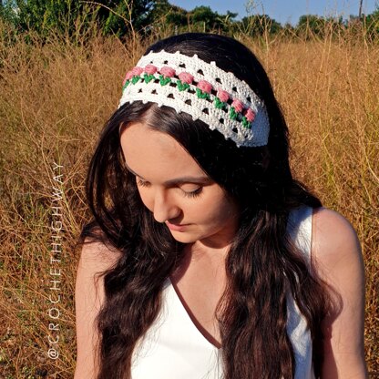 With its crisp & textured lace made up of criss-cross stitches, adorned with three dimensional & luscious tulip flowers and bordered by a round of ever-so-delicate picots, this headband is an elegant accessory that wants to make you and your little ones feel like queens and princesses. Whatever the season, this graceful headband will make you feel all the spring vibes!