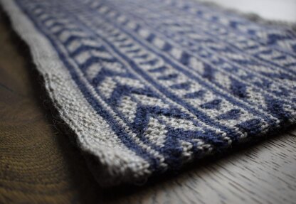 The cowl is knitted in the round with 3.5mm (US 4) circular needles (length 40cm (16”)) and 3mm (US 2.5) circular needles (length 40cm (16”)). It is knit from a moss stitch edging, followed by fair isle worked in stockinette (knit all rounds), and then a moss stitch edging before the cast off edge.