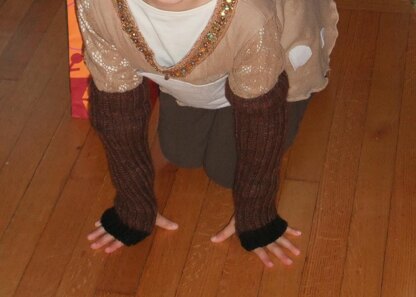 These simple ribbed fingerless gloves are designed to resemble the front legs and hooves of a fawn. They can be worn for fun as a costume, or as everyday hand and arm warmers. The thumb opening is a slit, and can be invisible if the wearer hides his or her thumbs inside and pulls the mitt tips up over the fingertips, to hide them and look more like a real fawn. Available in English or French.